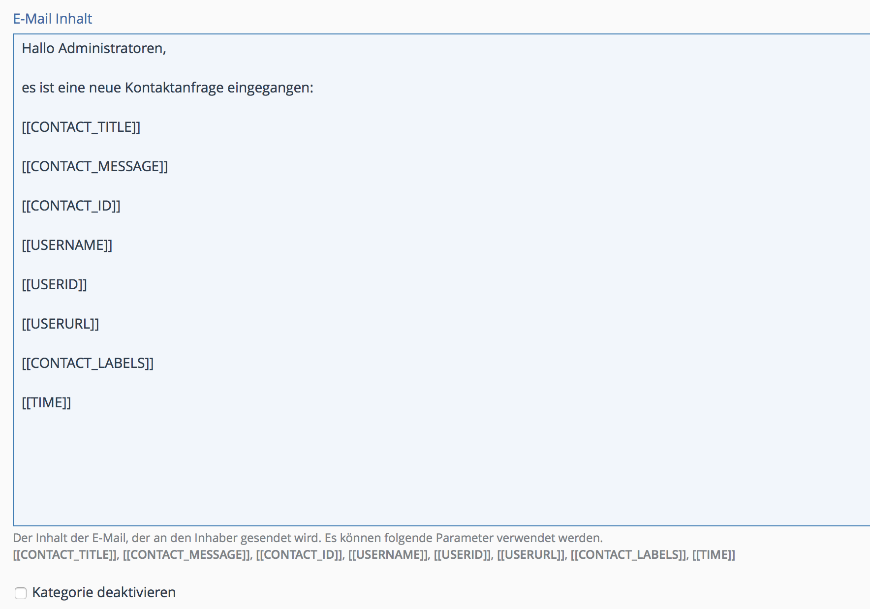 [[CONTACT_TITLE]], [[CONTACT_MESSAGE]], [[CONTACT_ID]], [[USERNAME]], [[USERID]], [[USERURL]], [[CONTACT_LABELS]], [[TIME]])