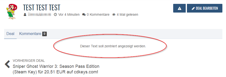 Könnte dieser Fehler bitte behoben werden? Das wäre super! Sonst ist es unmöglich, zentrierten Text zu erstellen, der auch in der News Übersicht zentriert wird. ![]()