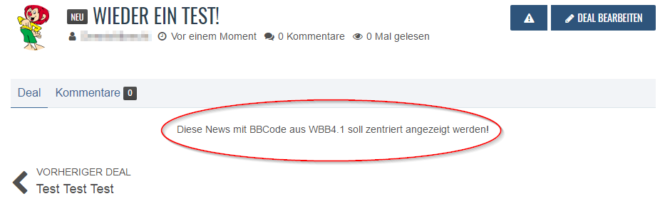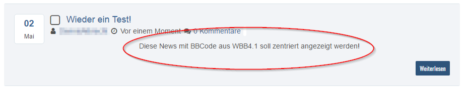 Kopiere ich eine News aus dem alten WBB4.1 mit dessen BBCode zum Zentrieren, dann wird sowohl die News selbst als auch in der Übersicht zentriert angezeigt. Aber diesen BBCode habe ich im WSC ja so nicht mehr zur Verfügung! Da wird ja alles in das HTML Format umgewandelt und ich erhalte die obige fehlerhafte Ansicht. ![]()