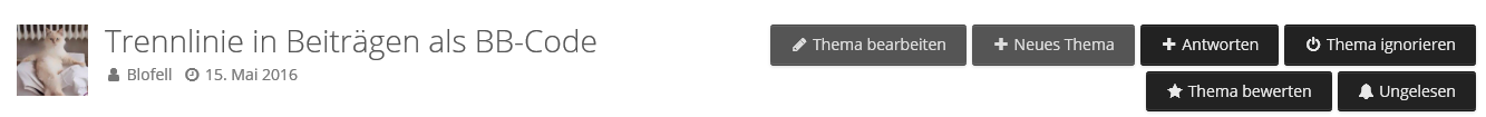 • Das Button ist wie z.B. das Atwort-Button OBEN angebracht. Leider werden mir neben dem Antwort Button auch das Ungelesen, Neues Thema, Thema Ignorieren, Thema Bewerten und natürlich für mich als Admin das Thema bearbeiten-Button angezeigt. Das ist also Oben schon sehr eng. Ist es möglich die Buttons deiner Plugins: Ungelesen, Themen bewerten, Thema Ignorieren in die Leiste im ersten Beitrag zu verschieben? (Die Leiste wo u.a. Zitieren, Beitrag melden und das Like-Button ist -> SmallButton.)