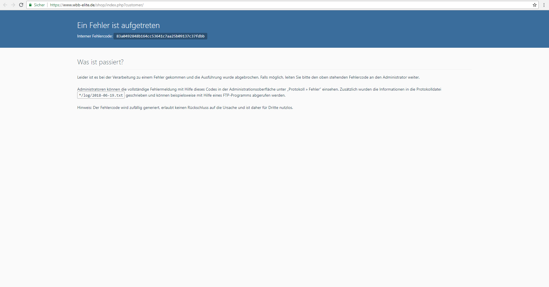 Administratoren können die vollständige Fehlermeldung mit Hilfe dieses Codes in der Administrationsoberfläche unter „Protokoll » Fehler“ einsehen. Zusätzlich wurden die Informationen in die Protokolldatei */log/2018-06-19.txt geschrieben und können beispielsweise mit Hilfe eines FTP-Programms abgerufen werden.