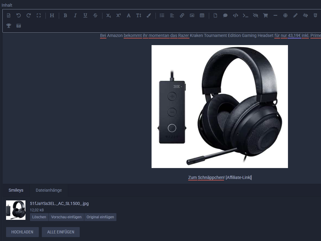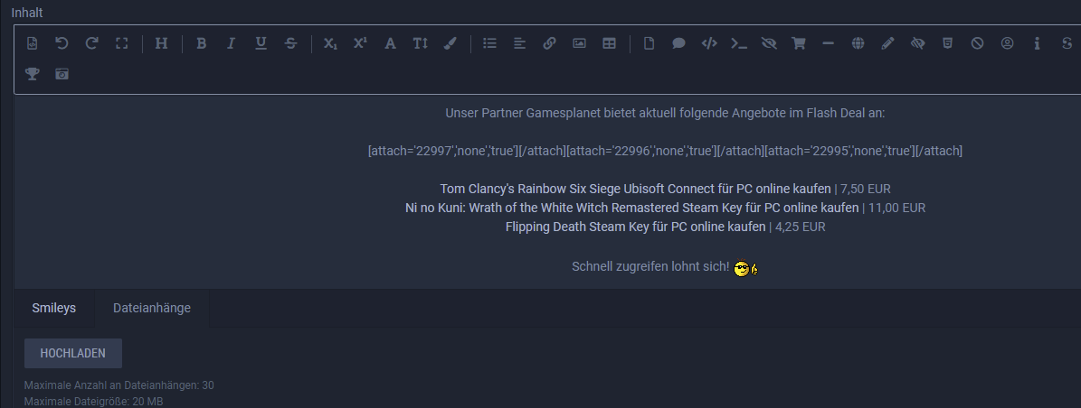 Es sind in der News nur die Platzhalter für die hochgeladenen Bilder zu sehen. Anhänge gibt es dann keine.