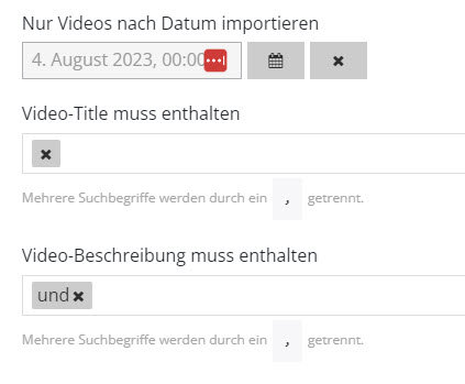 • Wir haben einen Videokanal von YouTube bei uns eingebettet. Da er auch englische Videos beinhaltet und wir nur die deutschsprachigen synchronisieren möchten, haben wir unter „Video-Beschreibung muss enthalten“, als Schlüsselwort „und“ eingetragen. Leider werden dadurch keine Videos mehr synchronisiert, auch nicht jene, welche in der Beschreibung das Wort „und“ enthalten. Worauf muss geachtet werden, damit die Synchronisation klappt?
