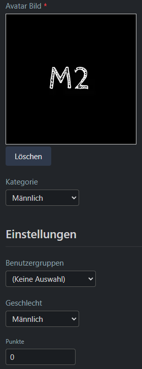 Avatar = Keine Auswahl, keine Gruppe, keine Kategorie, Standard Avatar und Konfiguration > Benutzer