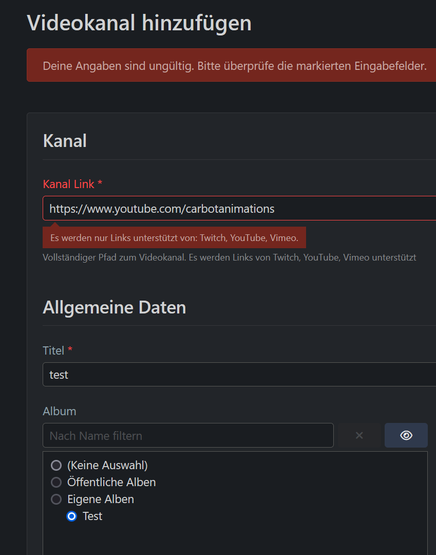 Außerdem kann ich keine Videokanäle hinzufügen, unabhängig davon ob SEO an oder aus ist, es kommt immer die Fehlermeldung : Es werden nur Links unterstützt von: Twitch, YouTube, Vimeo.