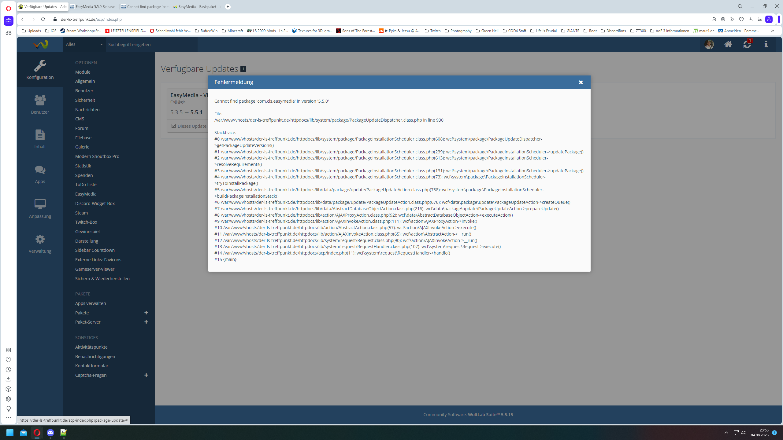Hallo ich habe seit heute nach dem Update auf Version: 5.5.2 folgende Fehlermeldung.