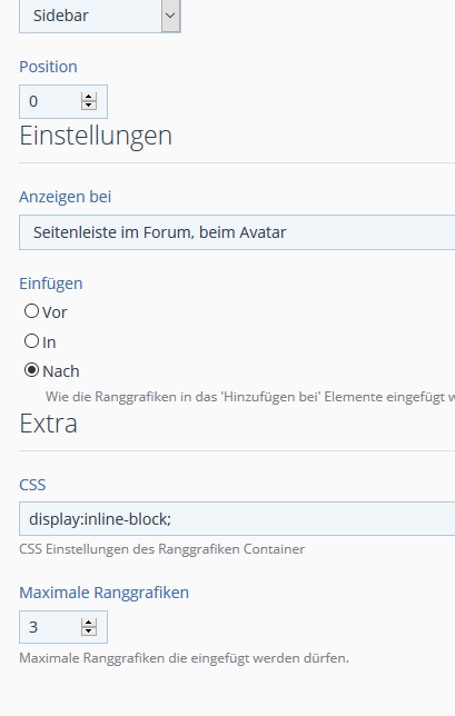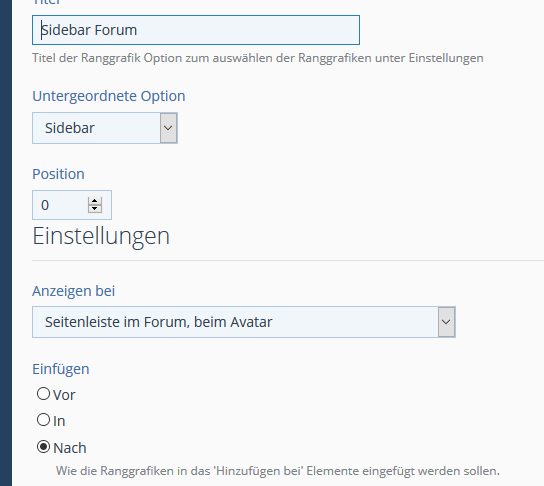 Ich habe eine Benutzergruppe "Owner" dazu einen Rang angelegt mit "Owner", diesen Rang zeigt er problemlos im Forum in der Seitenleiste an. Jetzt sind noch die Ränge "Neuling, Anfänger usw" dazugekommen, ebenfalls mit einem Rang. Jetzt habe ich noch einen Test Rang angelegt "Ave Maria" (rang muss genutzt werden), wähle ich jetzt unter Profil bearbeiten alle 3 Ränge aus, zeigt er nur den Owner und Anwärter an, der Ave Maria bleibt aus.