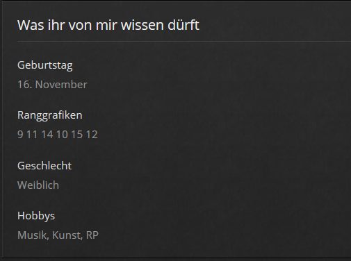 Dort wurden aber mal die Ranggrafiken angezeigt. Gut, es war sowieso nur für Administratoren sichtbar. Ist also nicht so schlimm. Es wurmt mich aber, weil es früher in Ordnung war. Muss ich mal die letzten Plugins überprüfen. Vielen Dank für deine Mühe.