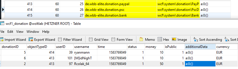 Im ACP habe ich dafür leider nichts gefunden. Deshalb habe ich die Datenbank-Einträge per Hand vorgenommen. Jedenfalls, soweit ich glaube dass es korrekt sei. Die Spenden werden dennoch nicht aufgelistet.