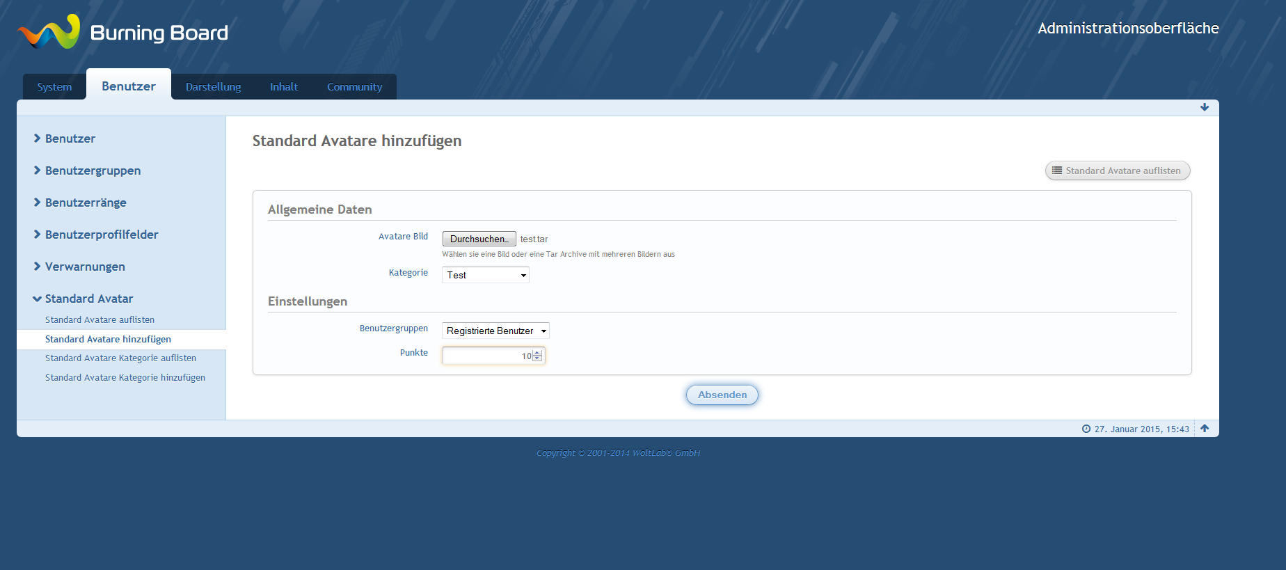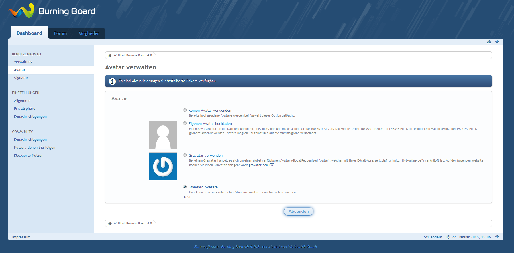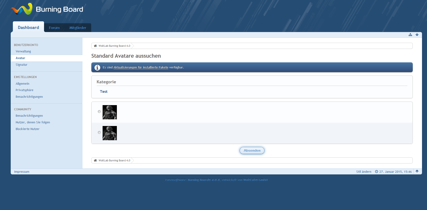 Es kann ausser dem ein Avatar ausgewählt werden der bei der Registrierung dem Benutzer hinzugefügt werden.