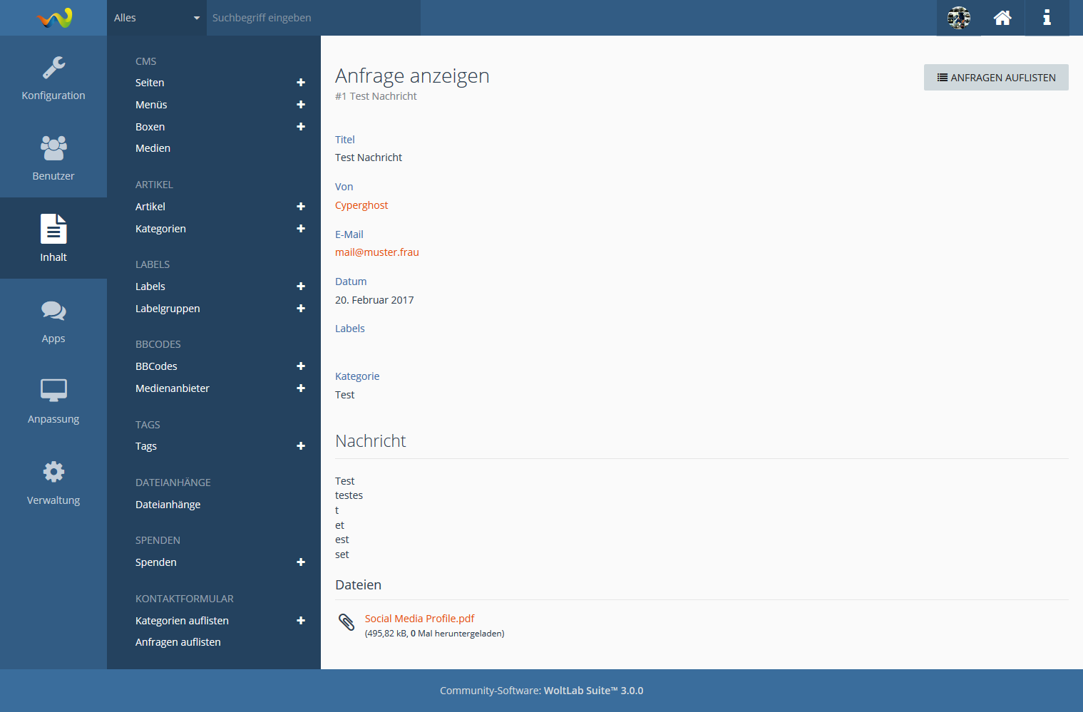 Mit diesem Kontaktformular haben Benutzer sowohl auch Gäste die Möglichkeit, Kontakt mit dem Forum aufzunehmen. Über das ACP können verschiedene E-Mail Adressen festgelegt werden, auf welche die Kontaktanfrage zu guter letzt gesendet werden soll. Ebenfalls ist es optional möglich, eine automatische Antwort an den Absender senden zu lassen. Dateianhänge können in das Kontaktformular mit hochgeladen werden.
