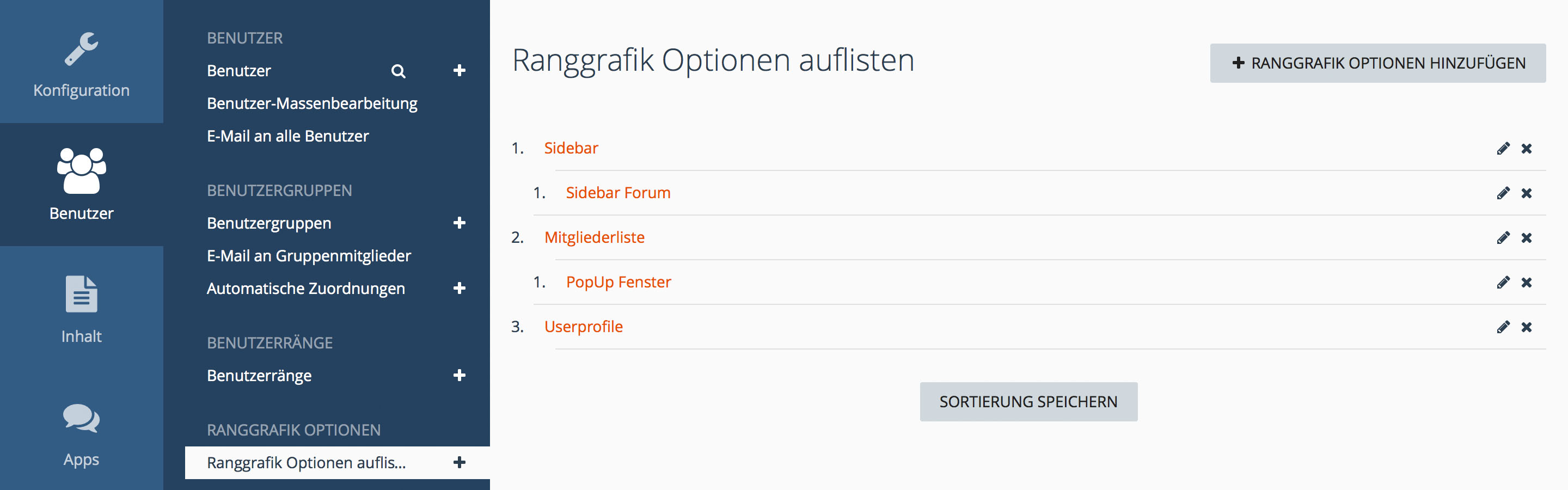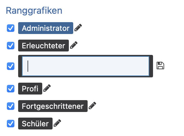 - Konfiguration der Ranggrafiken Benutzer->Benutzerränge die jeweiligen Bearbeiten und oder hinzufügen die man gerne haben möchte
