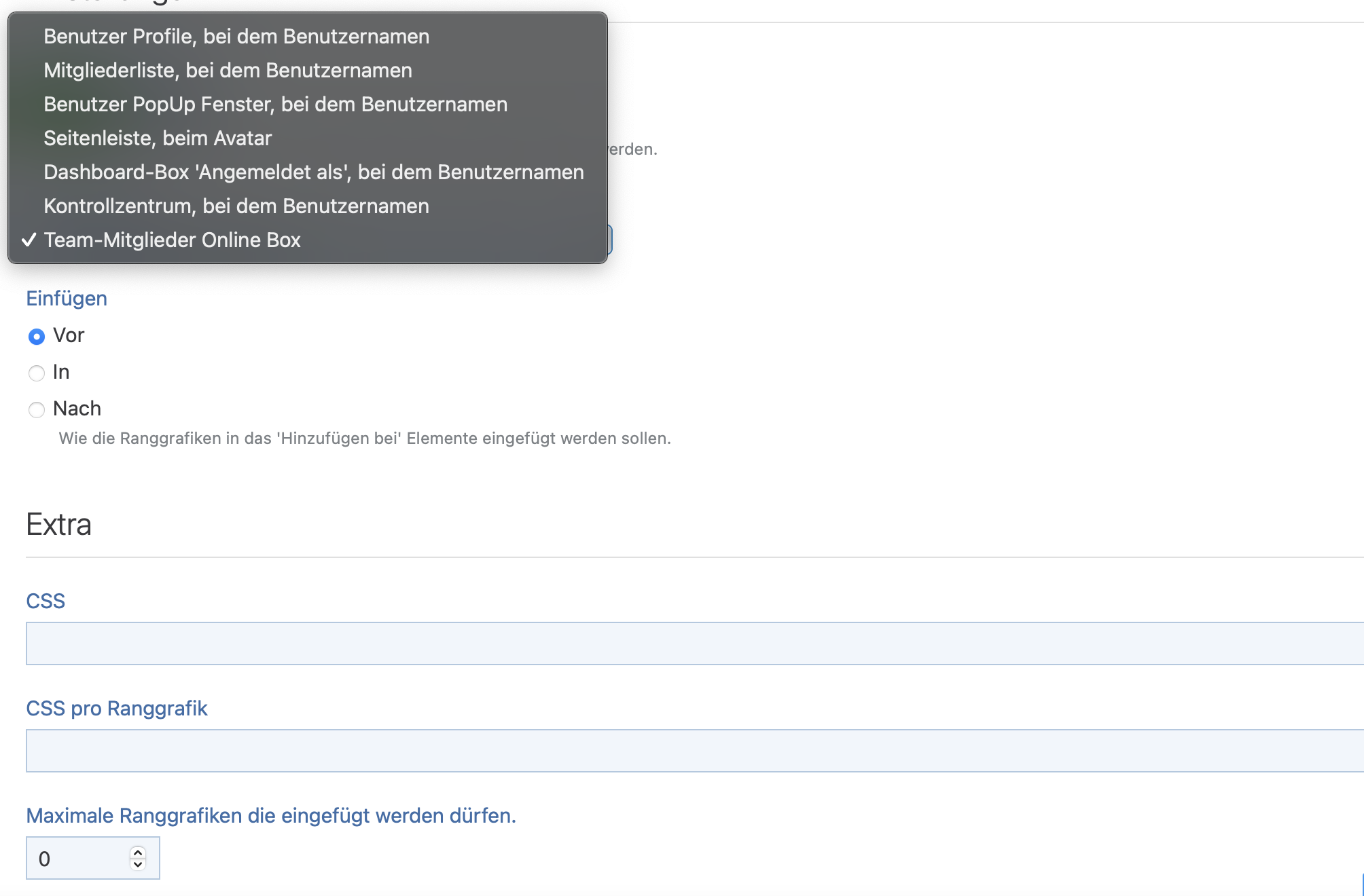 - Zusätzliche Positionen für das einfügen der Ranggrafiken hinzufügen, im ACP unter Benutzer->Ranggrafik Optionen->Ranggrafik Optionen auflisten, sofern gewünscht.