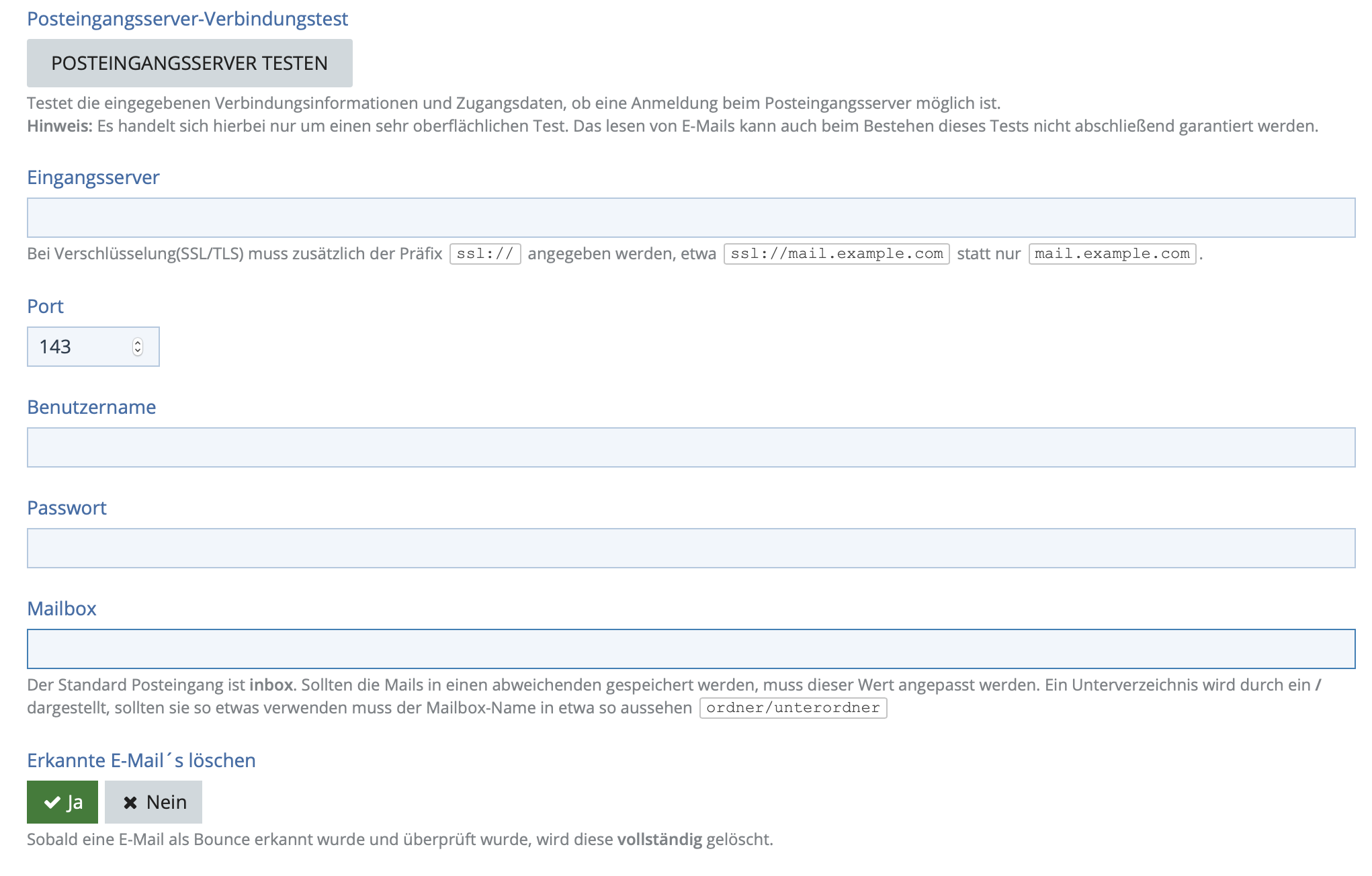 Das System bietet eine integrierten Test, mit dem man überprüfen kann ob eine Verbindung zu dem Posteingangsserver möglich ist. Jedoch kann bei einem erfolgreichen Login nicht garantiert werden, das das System fehlerfrei läuft. Jedoch können damit Verbindungsprobleme erkannt werden und ob das eingetragene Postfach existiert.