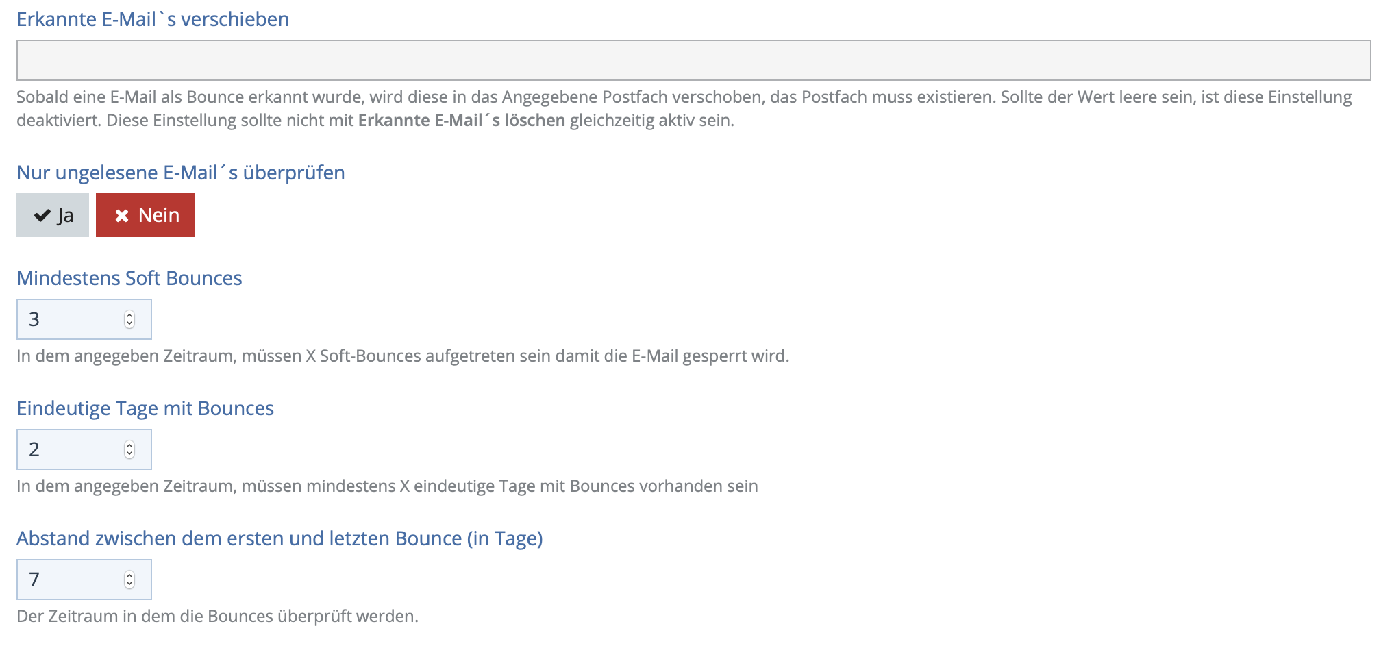 Soft-Bounces führen nicht direkt zu einer Sperrung der E-Mail, daher gibt es drei Optionen die dafür konfiguriert werden müssen/können.