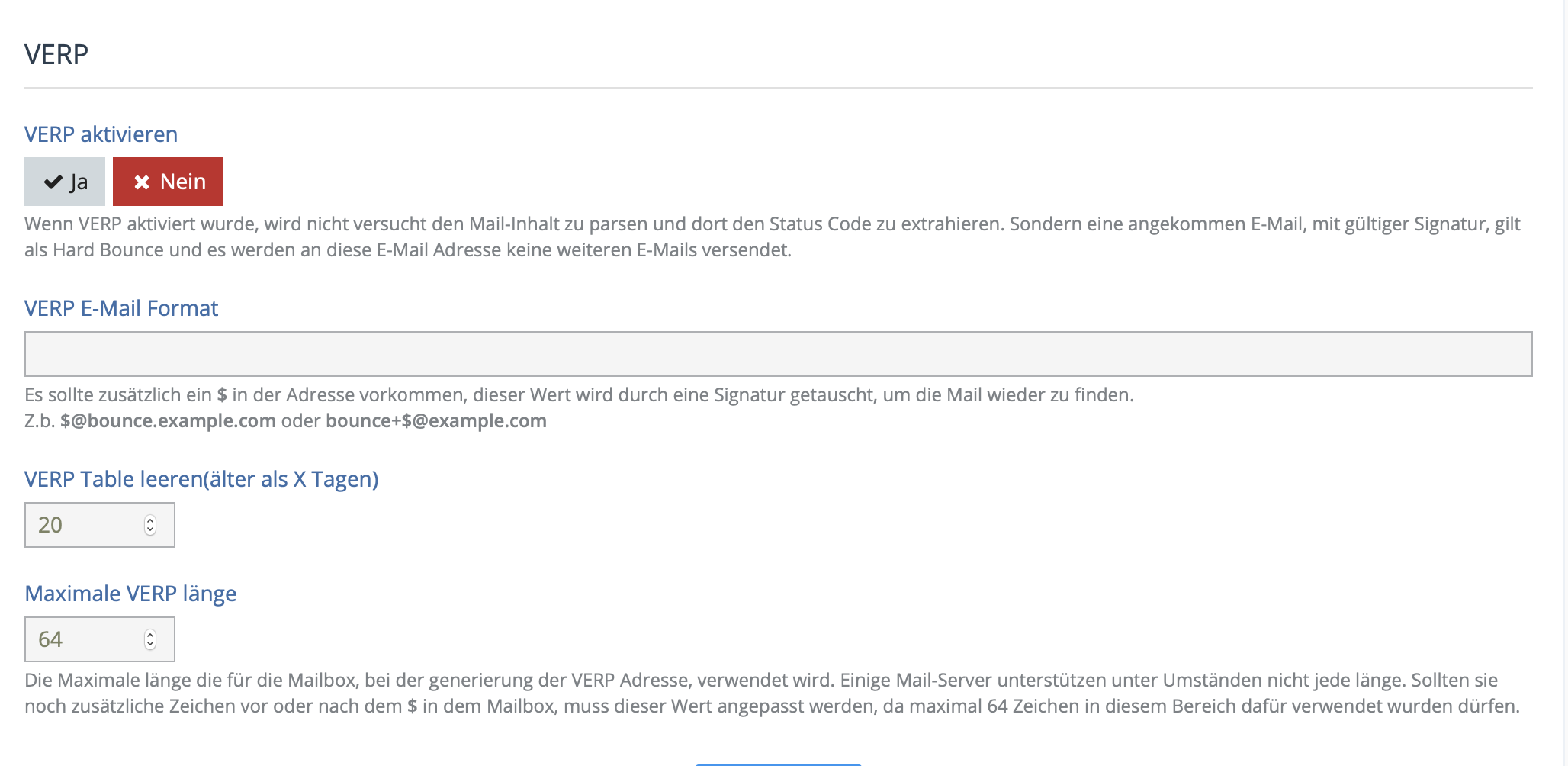 VERP ist eine einfache Variante um Bounces zu erfassen, dabei wird nicht versucht die E-Mail zu parsen und aus dieser den Status Code und ebenfalls die Diagnose Meldung zu extrahieren. Da es viele Mail Anbieter gibt, werden die Reports bei einer nicht zugestellten E-Mail immer unterschiedlich ausfallen. Daher können nicht alle Bounces erkannt werden. Sofern VERP aktiviert wurde, wird nur der Return Path, ausgewertet in dem alle notwendigen Informationen enthalten sind, anschließend wird die E-Mail sofort blockiert und ggfs. auch der dazugehörige Benutzer. Diese Funktion kann jedoch nicht immer aktiviert werden, da es auf dem Mail-Server eine Spezielle Konfiguration voraussetzt. Bitte überprüfen sie vorher ob das ganze möglich ist oder nicht, ansonsten können die E-Mails nicht zugestellt werden.