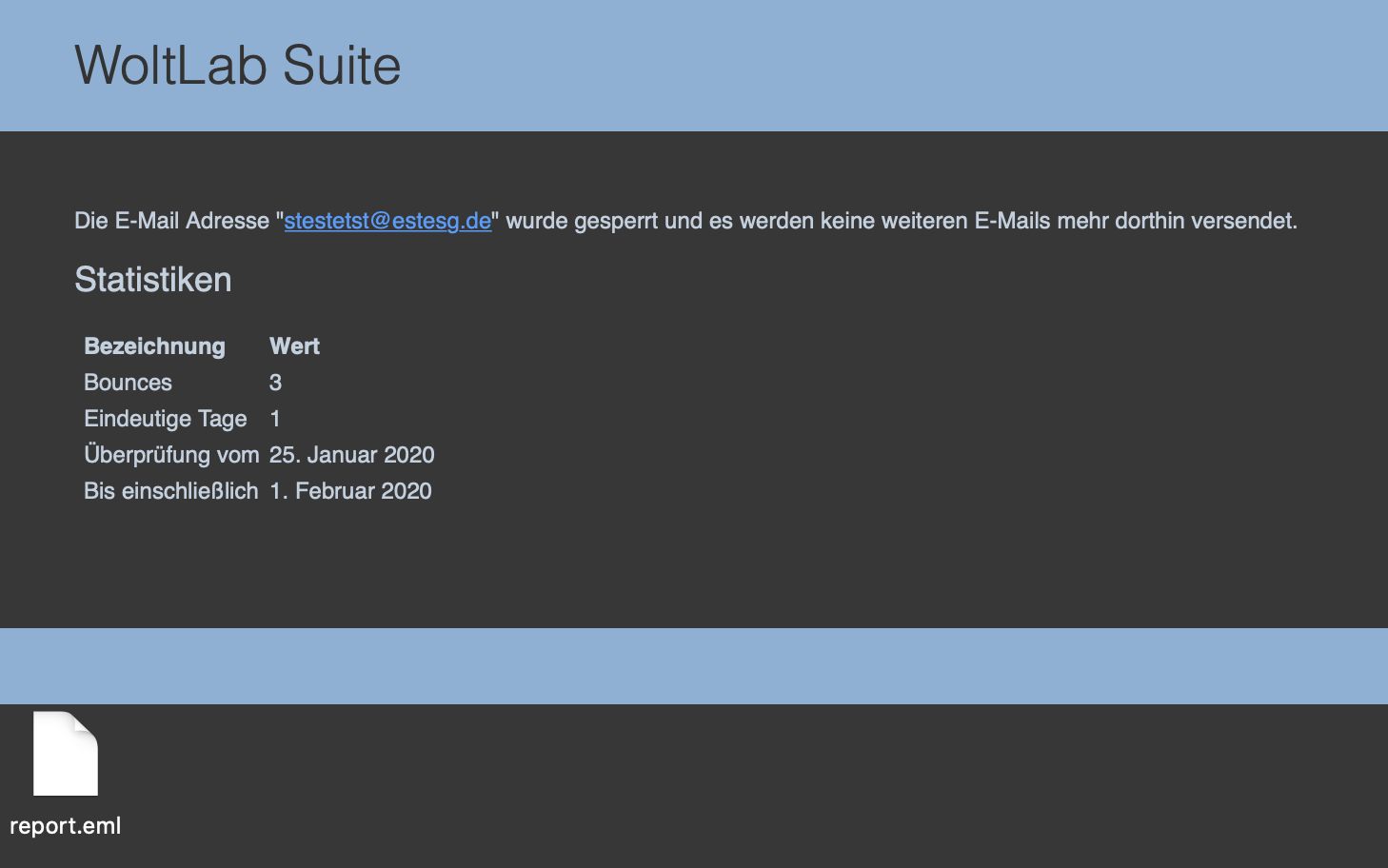 Sofern eine E-Mail Adresse blockiert wurde kann der Administrator benachrichtige werden, dabei wird die E-Mail Adresse die im ACP hinterlegt wurde für den Administrator verwendet. In dieser E-Mail ist einmal die E-Mail Adresse vorhandne und der Benutzer, sofern es eine E-Mail von einem Benutzer war, und der Grund(Soft, Hard oder VERP) wodurch die E-Mail blockiert wurde. Bei einem Soft-Bounce wird zusätzlich noch ein Zeitraum angegeben in dem Zuviel Bounces aufgetreten sind. Zusätzlich wird der Report, der für die Sperrung gesorgt hat angehangen.