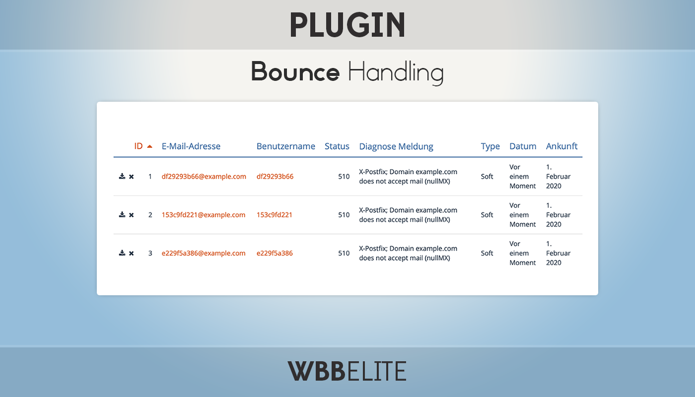 Dann ist genau das Plugin das richtig für Sie, mit Hilfe diesem Plugin werden an E-Mail Adressen die nicht mehr existieren, das Postfach seit Jahren voll ist und keine Mails empfangen kann oder aus anderen Gründen E-Mails nicht zugestellt werden können, keine weiteren E-Mails versendet. Durch einen integrierten Parser werden die Informationen ob es sich um einen Soft oder Hard Bounce handelt extrahiert. Ausserdem unterstütz das System VERP, mit dem vereinfacht Bounces erkannt werden und Maßnahmen ergriffen werden können.