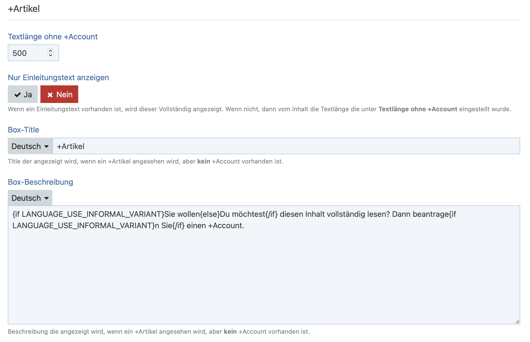- Die länge des Textes der angezeigt wird, wenn der Benutzer nicht das Recht hat Kann +Artikel vollständig
