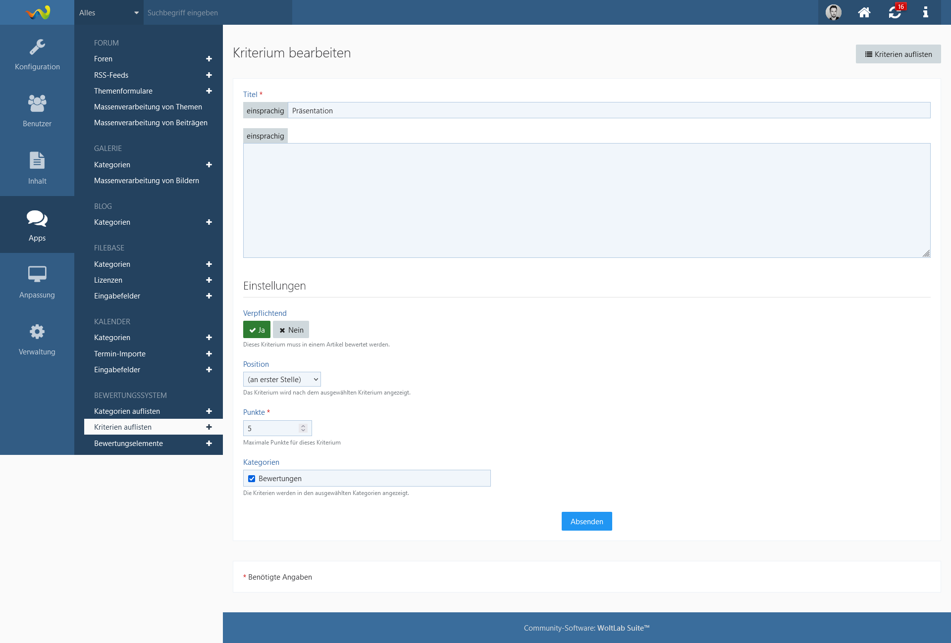 Erstellen Sie strukturierte Bewertungen nach vorgegebenen Kriterien. Dieses Modul eignet sich ideal für Bewertungsprozesse, bei denen bestimmte Aspekte zwingend berücksichtigt werden müssen, wie beispielsweise Produktbewertungen oder Dienstleistungsbewertungen.